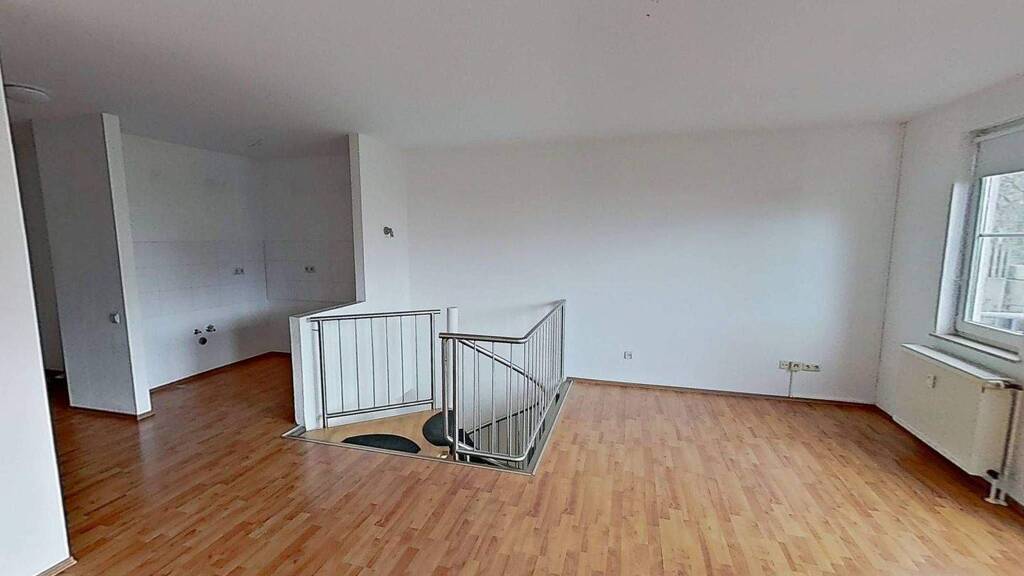 Der Mittelpunkt dieses besonderen Mietobjekts ist das geräumige und lichtdurchflutete Wohn- und Esszimmer in der oberen Etage. Große, teils bodentiefe Fenster lassen viel Tageslicht herein und schaffen eine angenehme Atmosphäre zum Entspannen und Wohlfühlen. Einen Platz zum Kochen und Essen gibt es im offenen Küchenbereich des Raumes, in dem sich ein Fliesenspiegel sowie alle notwendigen Anschlüsse für Ihre private Einbauküche befinden.