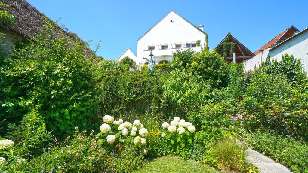 Sowohl über einige Stufen von der Ostterrasse als auch vom Wellness-Bereich gelangt man in den Traumgarten. Liebevoll vom Landschaftsarchitekten angelegt, regelmäßig gepflegt vom Gärtner ist der Garten mit üppigen Pflanzen, liebevollen Plätzen, Gemüsebeeten und Biotop eine wahre Grünruheoase. Der Garten erstreckt sich bis zur Hauptstraße, wo sich auch ein weiterer Eingang bzw. eine Einfahrt befinden.