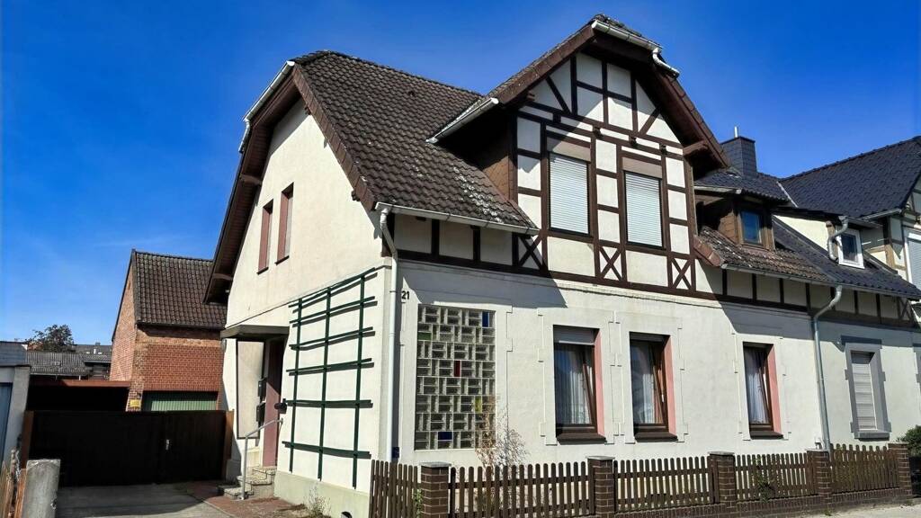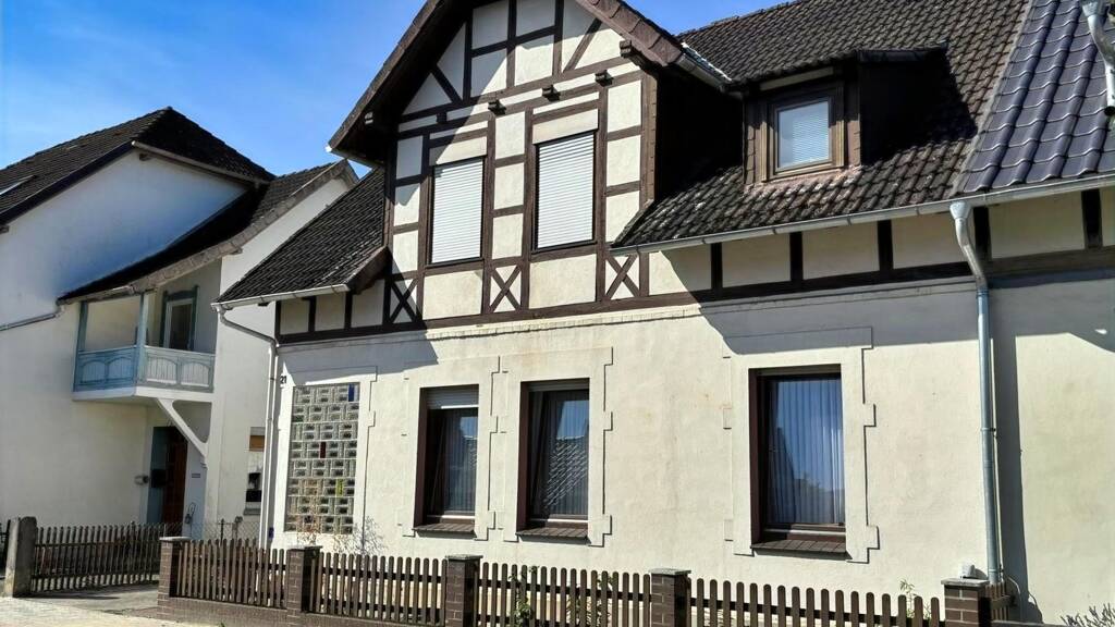 -Massive Doppelhaushälfte mit zwei Wohnungen, Nebengebäude, Garage und Carport- Die Wohnung im Erdgeschoss wurde zuletzt von der Eigentümerin genutzt und teilt sich auf in den Eingangsflur, Küche, vier Wohnräume (ein Zimmer befindet sich bereits im Anbau, hat aber einen direkten Zugang in die Wohnung und in den Innenhof) und einem Badezimmer. Von der Küche hat man einen direkten überdachten Zugang in den Innenhof, die Wohnfläche beträgt ca. 76 m². Die vermietete Wohnung im Obergeschoss erreicht man über eine offene Holztreppe im Treppenhaus von dem man auch in den Keller kommt. Die Wohnung verfügt über eine Küche, drei Wohnräume und ein Bad, die Wohnfläche beträgt ca. 65 m². Das Objekt ist teilunterkellert (Abgang mit Vorraum und ein geteilter Kellerraum für die beiden Wohneinheiten). Im Anbau/ Nebengebäude befinden sich ein Duschbad, der Heizraum und das Öllager (3 x 2.500 Liter Kunststofftanks), zwei Abstellräume und eine Werkstatt sowie eine Garage die über einen Aufgang zum Bodenraum verfügt. Die Fenster im Erdgeschoss sind aus Holz, isolierverglast und zusätzlich mit Rollläden ausgestattet, im Obergeschoss aus Kunststoff. Geheizt wird mit einer Ölzentralheizung aus dem Jahr 1993 der Firma Viessmann (Niedertemperaturkessel), die auch das warme Wasser aufbereitet. Das Dach ist als Kaltdach mit einer Betonpfanne eingedeckt die mit Zement verstrichen wurde, der Dachboden hat Stehhöhe und ist mit Holzdielen ausgelegt.