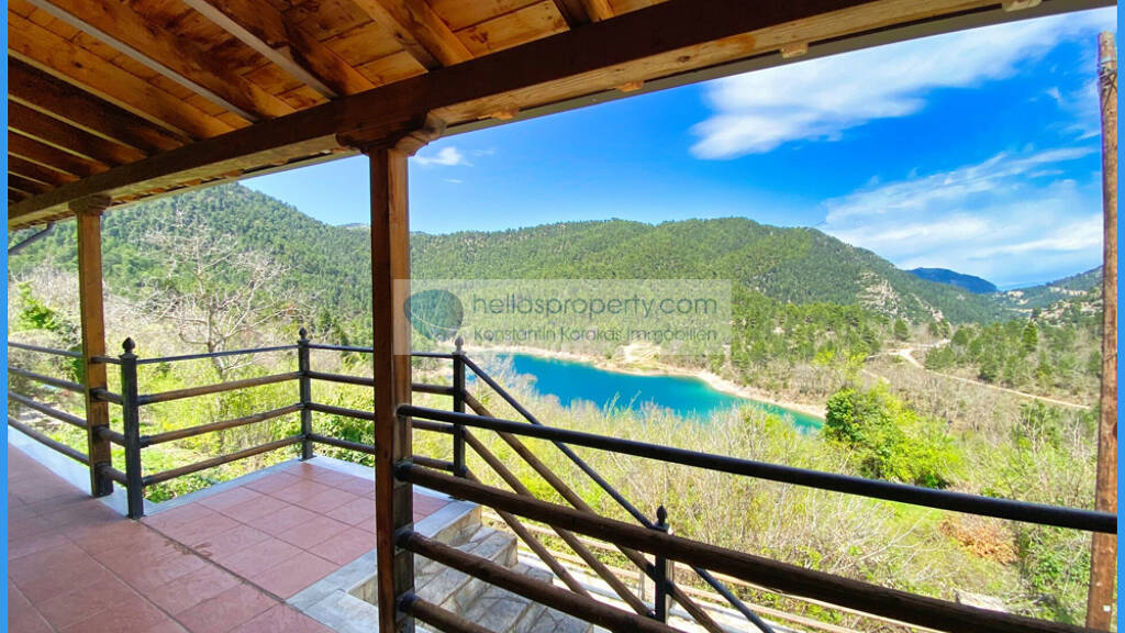 Eine zweistöckiges Haus, umweltschonend erbaut umgeben von üppigem Grün, eingebettet zwischen Bergen und mit Blick auf das kristallklare Wasser des Tsivlou-Sees.