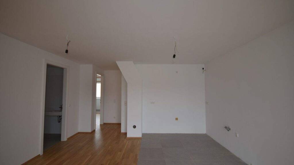 Vom Eingangsbereich gelangt man in ein kompakt geschnittenes Vorzimmer, das direkt in den Küchen- und Essbereich führt. Von hier aus hat man auf der rechten Seite Zugang zu einem kleinen Balkon. Auf der linken Seite befinden sich ein separates WC sowie das Badezimmer mit Dusche und Waschmaschinenanschluss. Vom Küchen- und Essbereich aus erreicht man links das gemütliche Wohnzimmer mit Zugang zu einer kleinen Loggia. Rechts liegt das Schlafzimmer, das ebenfalls einen Zugang zur Loggia bietet.