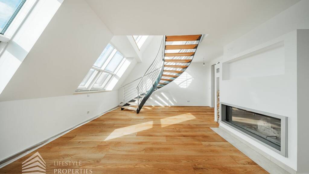 Der traumhafte Neubau liegt im Dachgeschoss und ist bequem mit dem Lift zu erreichen. Er erstreckt sich über eine Wohnfläche von ca. 223 m² und teilt sich wie folgt auf: sechs Zimmer, vier Bäder, vier WC sowie zwei Abstellräume. Die Haupträume sind mit hochwertigen Eichenholzdielen ausgekleidet, die Nassräume sind mit beigen Marmor gefliest. Die Highlights dieser Immobilie sind zweifelsohne die Dachterrasse sowie das begehbare Flachdach mit traumhafter Aussicht. Zusätzlich kann man einen Garagenstellplatz im Haus um 100.000.- Euro erwerben.