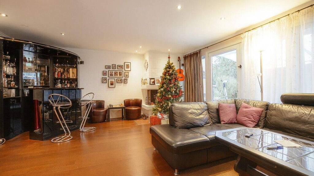 Der Eingangsbereich präsentiert sich einladend und führt direkt in den großzügigen, ca. 40 m² großen Wohn- und Essbereich. Hier sorgt ein Kamin für eine gemütliche Atmosphäre, während die moderne Einbauküche offen integriert ist. Von hier aus gelangen Sie auf die überdachte Terrasse - der ideale Platz, um den Blick in den schönen Garten zu genießen.