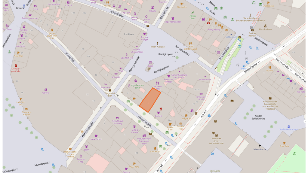 Die Fußgängerzone in der Bonner Innenstadt garantiert eine hohe Passantenfrequenz. Die Fürstenstraße zählt zu den frequentiertesten Straßen, in der sowohl Einheimische als auch Touristen einkaufen und flanieren. Die Nachbarschaft ist geprägt von hochwertigen Einzelhandelsgeschäften, Restaurants und Dienstleistungsunternehmen, die ein exklusives Einkaufserlebnis bieten und für eine anspruchsvolle Kundschaft sorgen. Diese Lage bietet somit ideale Voraussetzungen, um Ihr Geschäft einer breiten Zielgruppe zugänglich zu machen und die Sichtbarkeit Ihrer Marke zu steigern.