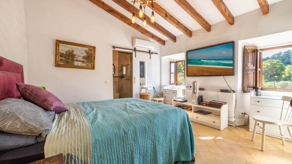 Erleben Sie das mediterrane Paradies in dieser rustikalen Finca in S'Arraco. Das Anwesen liegt auf einem bewirtschafteten Grundst?ck von knapp 8.000 m? und bietet einen herrlichen Blick ins Gr?ne. Der Bauernhof verf?gt ?ber ein gem?tliches Wohnzimmer mit Kamin, ein charmantes Esszimmer und eine rustikale K?che. Insgesamt bietet diese Immobilie vier ger?umige Schlafzimmer und drei Badezimmer. Der Au?enbereich in der unber?hrten Umgebung verzaubert mit einem Blumenmeer und einem idyllischen Garten. Die charmante Au?enbar mit Terrasse l?dt zum Verweilen ein, w?hrend der erfrischende Swimmingpool und der kleine Teich f?r entspannende Momente sorgen. Umgeben von ?ppiger Vegetation k?nnen Sie die Weitsicht genie?en und inmitten der Natur entspannen.