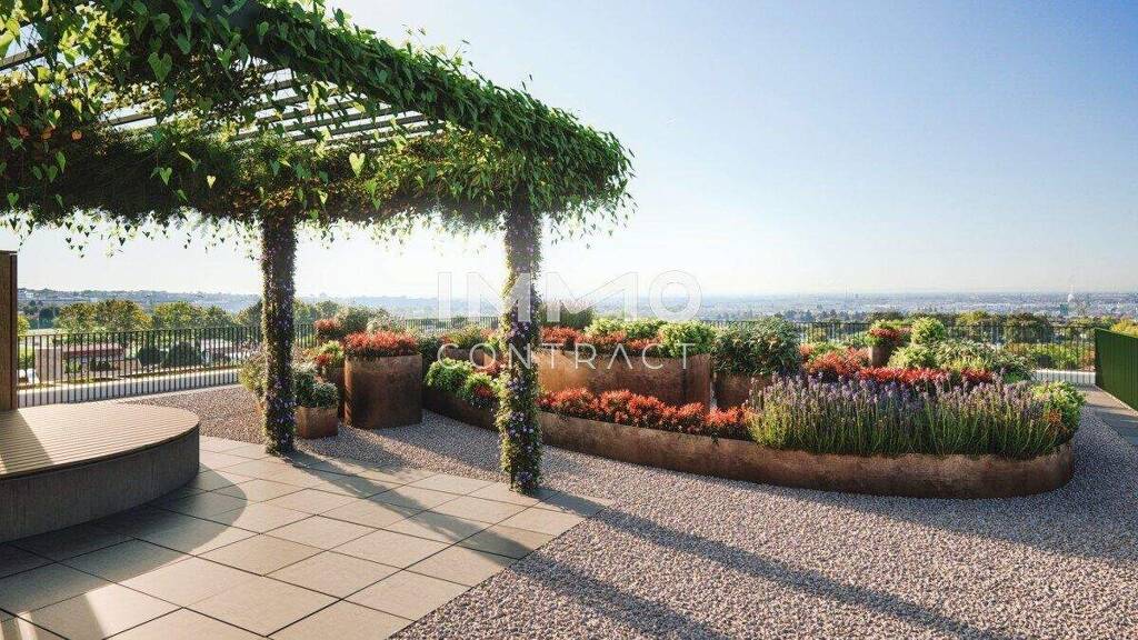 Eingebettet in die künstlerische Gartengestaltung von André Heller bieten die neuen Wohnungen einen großzügigen Blick in die weite Landschaft über die benachbarte Kleingartensiedlung. Das lebendige Farbenspiel der diversen Mosaikböden bei den Glashäusern und die mediterrane Bepflanzung im marokkanischen Garten schaffen eine harmonische Verbindung zwischen Architektur und Natur. Eine Allee aus Bambus bildet entlang der südlichen Grenze einen malerischen grünen Abschluss und eine geschützte Ruhezone für die Bewohner.