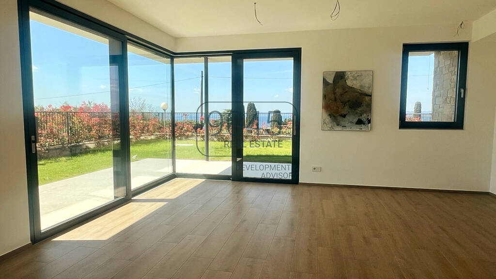 Erdgeschoss: Das Herzstück des Hauses ist das weitläufige Wohnzimmer mit offener Kücheninsel, das dank einer großen Eckverglasung einen atemberaubenden Blick auf den See bietet. Stellen Sie sich vor, wie Sie auf der angrenzenden Terrasse Ihr Abendessen genießen - umgeben von den faszinierenden Farben des Sonnenuntergangs über dem Gardasee.