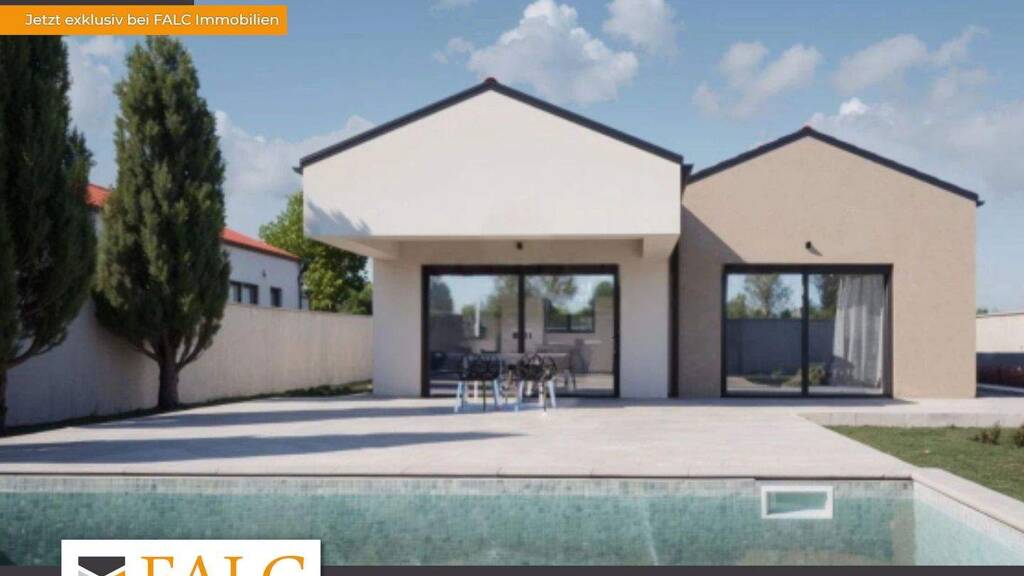 Der Grundriss überzeugt durch ein großzügiges, offenes Wohnkonzept mit Wohnzimmer, Küche und Essbereich, das viel Licht und ein angenehmes Raumgefühl bietet. Das Hauptschlafzimmer verfügt über ein eigenes Badezimmer, während zwei weitere Schlafzimmer und ein zusätzliches Badezimmer ausreichend Platz für Familie oder Gäste bieten. Von der Terrasse aus gelangt man direkt in den angelegten Garten und zum privaten Pool - ideal für entspannte Stunden im Freien.