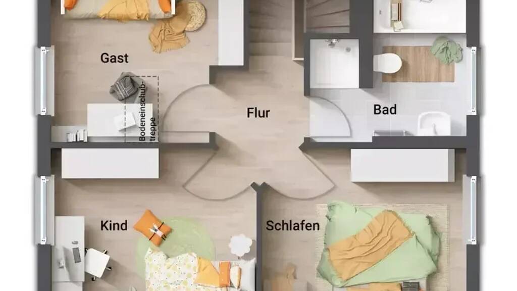 Im Dachgeschoss erwarten Sie drei weitere Zimmer. Ob Schlafzimmer, Kinderzimmer, Gäste- oder Arbeitszimmer – hier findet jeder sein persönliches Reich. Die ausgewogene Planung schenkt Ihnen genügend Platz und sorgt für entspanntes Wohnen in angenehmer Atmosphäre.