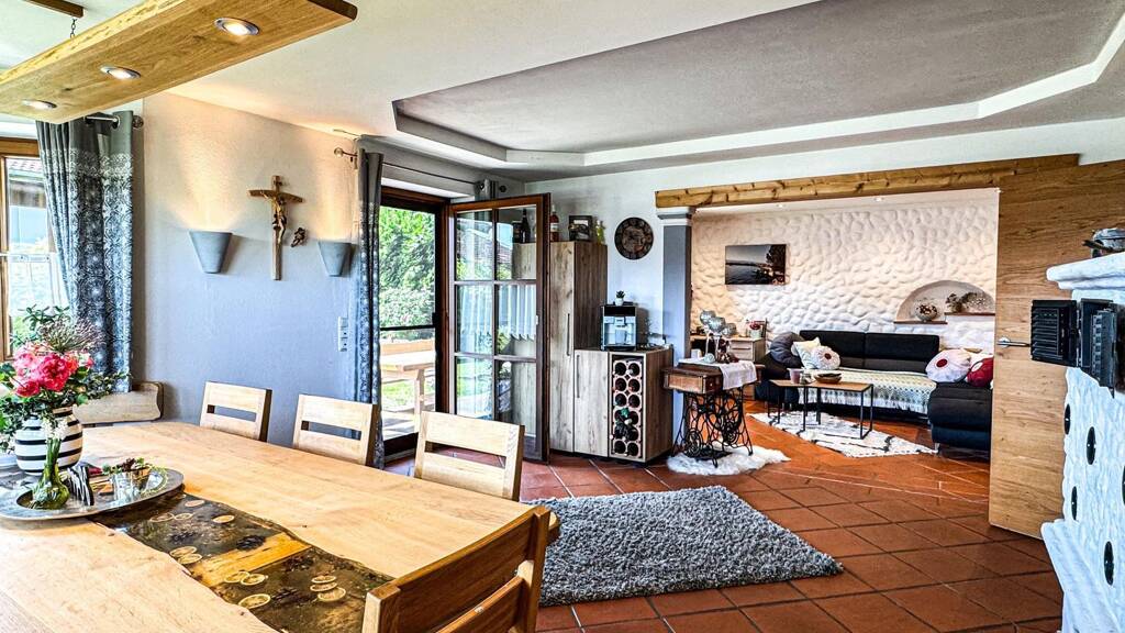 Der gemauerte Kachelofen im großzügigen Wohn-Esszimmer schafft an kalten Tagen eine gemütliche Wärme und senkt Ihre Heizkosten. Der Einsatz für den Kachelofen wurde erst in 2024 ausgetauscht.
