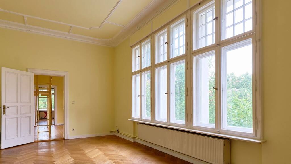Die angebotene Wohnung befindet sich im Hochparterre mit 5,5 Zimmern, zwei Bädern und einer großzügigen Wohnküche. Erschlossen über das repräsentative Vorderhaus-Treppenhaus, präsentiert sie sich als klassische Belle-Étage-Wohnung mit einer elegant durchdachten Altbauaufteilung. Alle Räume sind sowohl über den Flur als auch miteinander verbunden, sodass ein Rundgang durch die Wohnung möglich ist – ein typisches und besonders reizvolles Detail der Berliner Altbauarchitektur aus der Kaiserzeit. Zur Straßenseite öffnen sich zwei repräsentative Räume: ein Arbeitszimmer mit Erkerpodest sowie ein Wohnzimmer mit vorgelagerter Loggia und Kamin. Angrenzend daran liegt der lichtdurchflutete Essbereich mit großflächigen Fenstern, der zu den ruhiger gelegenen Privaträumen führt – einem Kinder- oder Arbeitszimmer sowie dem Elternschlafzimmer mit En-Suite-Bad. Der lange Flur ist mit maßgefertigten Einbauschränken und Regalen ausgestattet und bietet reichlich Stauraum. Zusätzlichen Platz bietet der geräumige Hängeboden mit Fenster im Flur. Im rückwärtigen Seitenflügel befinden sich die großzügige Wohnküche mit Speisekammer, ein Gästezimmer sowie ein weiteres Duschbad.