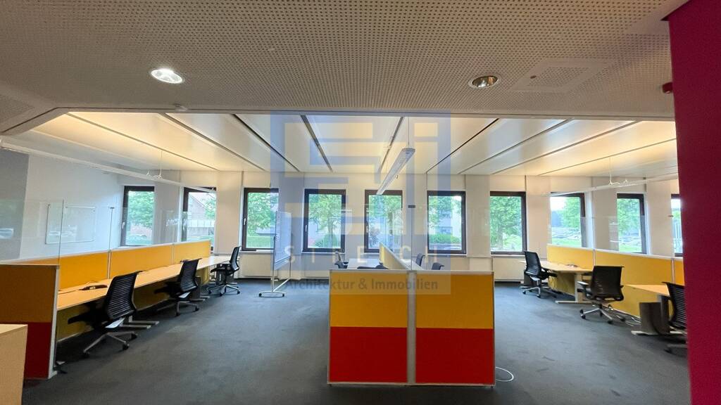 Die hier angebotene Bürofläche befindet sich im Erdgeschoss. Die Flächen wurden bisher für Großraumbüros genutzt. So wurden hier bis zu 60 Arbeitsplätze realisiert. Neben den großen, offenen Flächen gibt es noch kleinere Büros. Diese wurden zum Beispiel als Vortragsraum, Aufenthaltsraum oder sogar als Erste-Hilfe-Zimmer genutzt. Das hochmoderne Gebäude verfügt über eine Licht- und Windgesteuerte Außenverschattung und smarte Steuerung der Heiz- und Kühlelemente.
