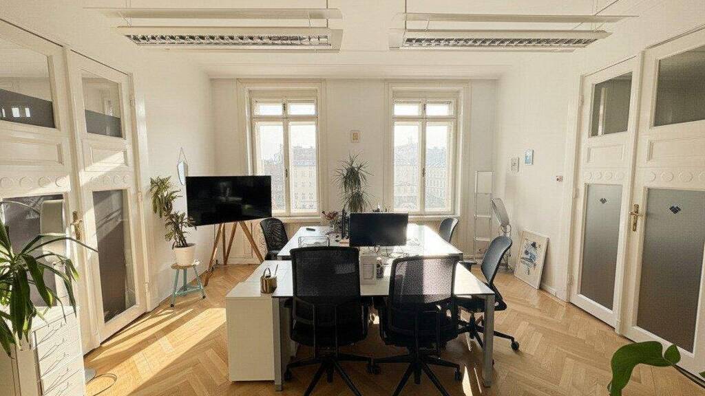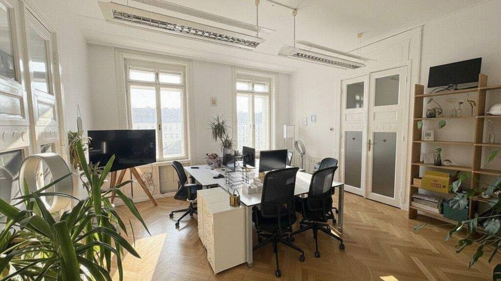 Das gesamte BĂĽro ist mit originalen Otto-Wagner-DoppelflĂĽgeltĂĽren und Kastenfenster sowie einer dezenten Otto-Wagner-Stuckdecke ausgestattet.
