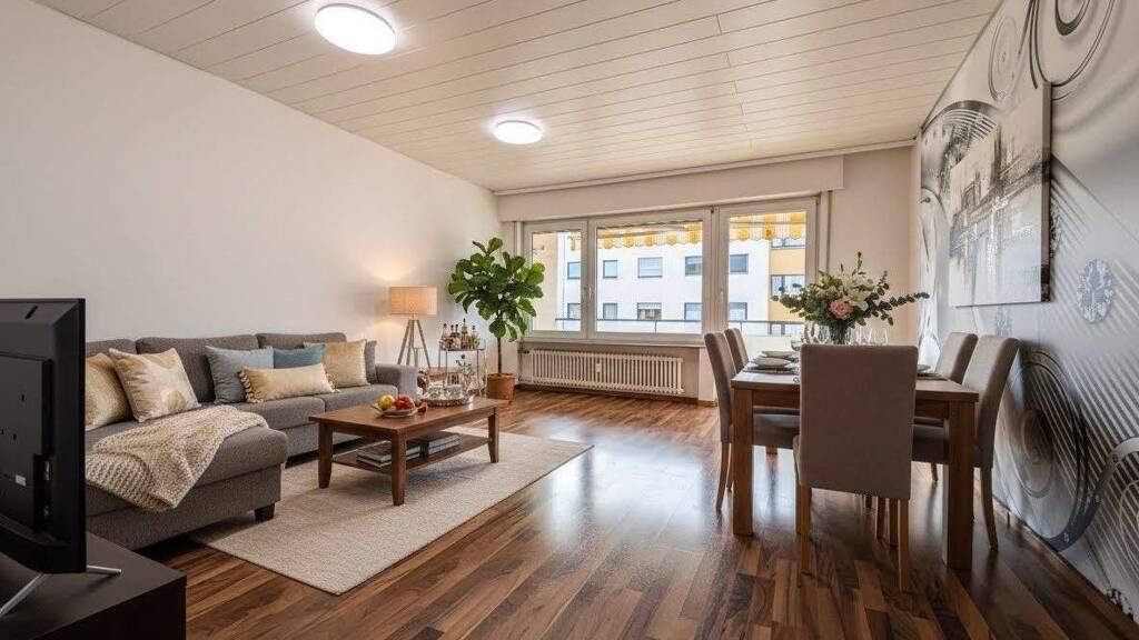 Das Herzstück ist der weitläufige Wohn- und Essbereich, der durch große Fensterfronten mit Tageslicht geflutet wird. Ob als gemütliche Familienzentrale oder eleganter Rückzugsort - hier ist Platz für Ihre Ideen. Das dritte Zimmer bietet Ihnen die Flexibilität, die Sie heute brauchen: Es eignet sich perfekt als ruhiges Home-Office für produktive Tage oder als liebevolles Kinderzimmer. In der separaten Wohnküche ist genügend Raum für kulinarische Abenteuer.