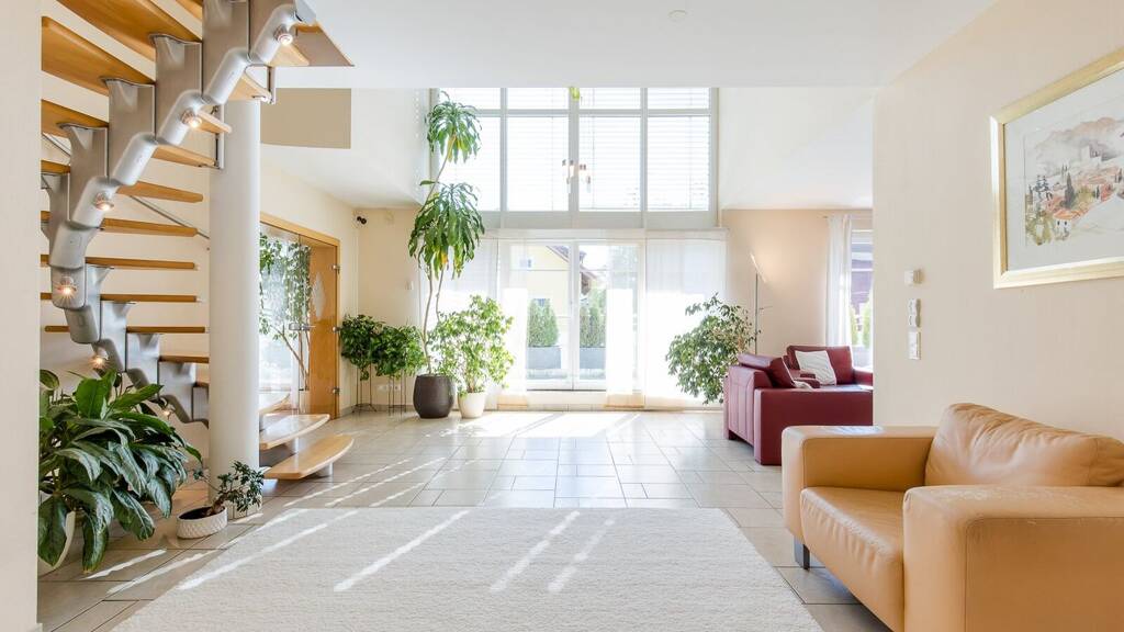 2003 in hochwertiger Massivbauweise (40-cm-Ziegelmauerwerk) errichtet, bietet die Gesamtfläche des Gebäudes von ca. 785 m² beeindruckende Raumhöhen und luxuriöse Ausstattungen, ein Hallenbad mit Wellnessbereich und Sauna, zwei große südseitige Terrassen und einen Wintergarten. Die sehr zeitgemäßen Ausstattungen reichen von großformatigen Fenstern mit Sicherheitsverglasung, zentraler Wärmeversorgung mittels Erdwärme-Fußbodenheizung mit automatischer Raumlüftung bis zu einer Alarmanlage. Auf der Südseite des Grundstücks befindet sich die Einfahrt von der Karl-Emminger-Straße, Besucherparkplätze sowie zwei großzügige Garagen mit funkgesteuerten Toren. Nach den anderen drei Seiten ist das Haus vom Garten umgeben. Im Erdgeschoß befindet sich der ca. 225 m² große Business-Teil mit einladendem Foyer, 5 großzügigen Büroräumen, Teeküche und 2 WC's , die Raumhöhe von 2,80 m sorgt für ein großzügiges Ambiente. Gesondert begehbar, derzeit dem Businessteil befinden sich im Untergeschoß hochwertige Lagerräume im Ausmaß von ca. 225 m² Das Obergeschoß und das Dachgeschoß beherbergen eine ca. 285 m² große Maisonette-Wohnung mit Haus Charakter, die sich ebenso für hochwertige gewerbliche Nutzungen anbietet. Das Obergeschoss umfasst ein großzügiges Entrée, einen ca. 53 m² großes Wohnbereich mit Kamin und offener Galerie sowie eine ca. 80 m² Terrasse. Der ca. 46 m² große Speise- und Küchenbereich verbindet zum Wintergarten sowie zur großen Terrasse. Auf dieser Ebene befinden sich weiters ein Gästezimmer und ein voll ausgestattetes Badezimmer. Das Dachgeschoß beeindruckt mit einer offenen Galerie und Zugang zum Master-Bedroom mit Ankleide, über komplett ausgestattetem Badezimmer sowie 2 weiteren großzügigen Schlaf- bzw. Kinderzimmern und eine südseitige Terrasse. Ein Hauswirtschaftsraum komplettiert das Raumprogramm auf dieser Etage. Besonderen Reiz bietet der tagesbelichtete Teil des Untergeschoßes mit dem ca. 50 m² großen Pool-Area mit Sauna, Infrarotkabine und Dusche/WC.