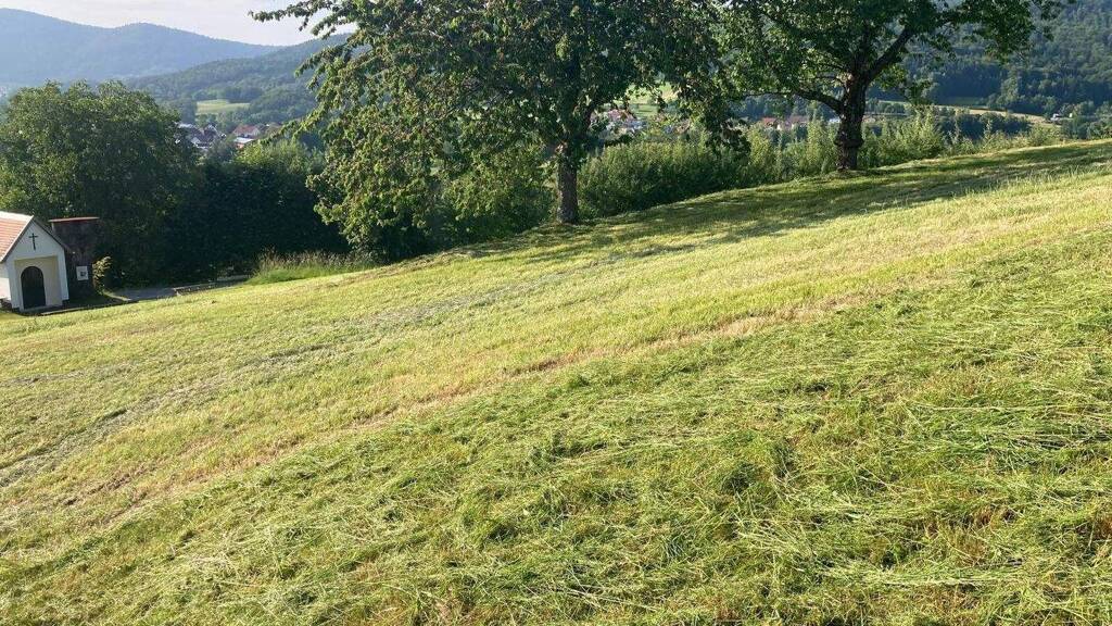 Das Grundstück weist eine leichte Hanglage auf und besticht durch eine unverbaubare Panorama-Aussicht über die umliegenden Wiesen und Wälder.