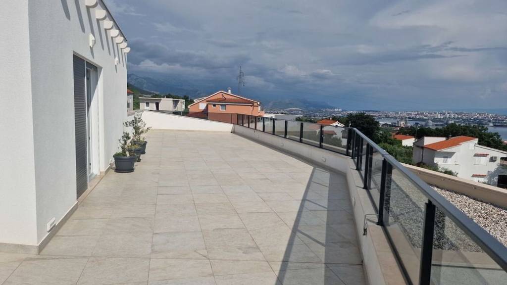 Eine luxuriöse neue Villa zum Verkauf, gelegen auf einem großen Grundstück in einem Vorort von Split. Die Villa befindet sich in ruhiger Lage, weit weg vom Trubel der Stadt und gleichzeitig nur wenige Autominuten vom Strand, dem Flughafen und den historischen Zentren von Split und Trogir entfernt. Die Villa wurde 2020 unter Verwendung hochwertiger Materialien und modernster Technologie erbaut und verfügt über vier Etagen, die durch Innentreppen verbunden sind. Der Innenraum ist geschmackvoll mit eleganten Möbeln eingerichtet und mit modernen Geräten ausgestattet. Im Erdgeschoss gibt es ein geräumiges offenes Wohnzimmer mit Küche und Esszimmer, ein Schlafzimmer mit Bad, ein Spielzimmer mit Billard und Tischfußball, einen Abstellraum und ein Gäste-WC. Das Wohnzimmer öffnet sich durch Glasschiebewände zu einer teilweise überdachten, großzügigen Terrasse mit einem 50 m² großen Infinity-Pool und einer Sonnenterrasse. Die erste Etage besteht aus vier Schlafzimmern mit jeweils einem Ankleidezimmer, einem Badezimmer und einer Terrasse. Auf dieser Etage gibt es auch einen Bereich mit Fitnessraum, Sauna, Dusche und einer schönen geräumigen Terrasse mit Whirlpool und Meerblick. Im zweiten Stock befindet sich eine herrliche Terrasse (ca. 120 m2) mit einem wunderschönen Panoramablick auf das Meer, die Inseln und die Stadt Split. Die Villa ist von einem gepflegten, wunderschön angelegten Garten mit Rasen, Blumen und mediterranen Pflanzen umgeben. In der Nähe des Pools gibt es einen Eingang zum Keller (ca. 80 m2), der als Fitnessraum, Abstellraum oder Ruhebereich mit Taverne und Weinkeller ausgestattet werden kann. Auf dem Grundstück gibt es außerdem eine überdachte Terrasse mit Grill und ein Esszimmer sowie einen Parkplatz für vier Autos.