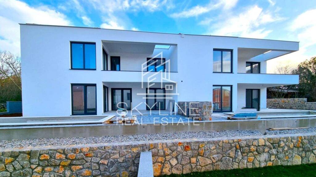 In Malinska, in ruhiger und attraktiver Lage nur 700 Meter vom Meer entfernt, steht ein modernes Doppelhaus mit Swimmingpool aus dem Jahr 2024 zum Verkauf. Das Haus besteht aus Erdgeschoss und Obergeschoss und verfügt über eine Netto-Wohnfläche von 140 m² sowie einen großzügig angelegten Garten von 159 m² mit Pool, Sonnendeck und zwei Stellplätzen.
