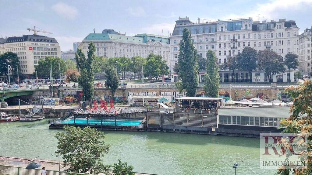 Das wahre Highlight ist jedoch die Lage: direkt am Donaukanal, mit einem unvergleichlichen Ausblick über das Wasser hinweg bis zum historischen ersten Bezirk. Dieses Panorama eröffnet ein einzigartiges Gefühl von Weite und Freiheit, wie man es inmitten der Stadt nur äußerst selten findet.