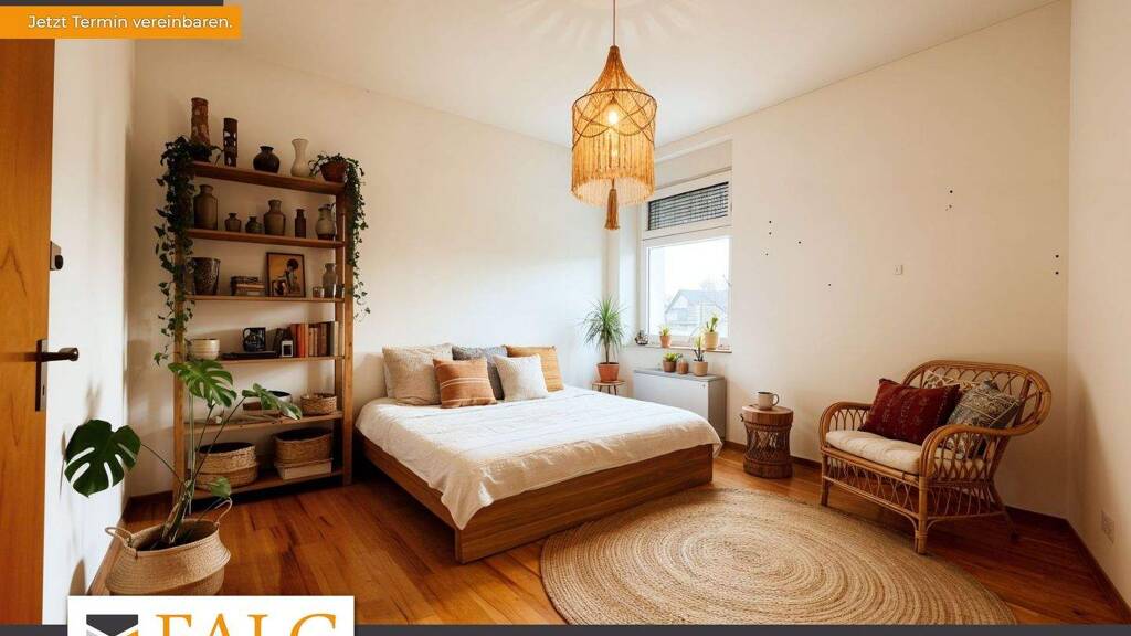 Das geräumige Schlafzimmer bietet genügend Platz für ein komfortables Doppelbett und einen großen Kleiderschrank, während das Kinderzimmer flexibel genutzt werden kann, sei es als Kinderzimmer oder als stilvolles Arbeitszimmer.