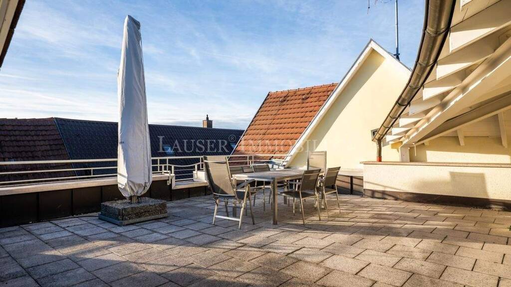 Der lichtdurchflutete Essbereich bildet den kommunikativen Mittelpunkt der Wohnung und öffnet sich auf eine rund sechzig Quadratmeter große, teilweise überdachte Terrasse, die den Wohnraum spürbar erweitert und einen tollen Blick auf die nahe und weitere Umgebung bietet. Ein stabiler, großformatiger Sonnenschirm sowie ein ausziehbarer Terrassentisch mit Bestuhlung stehen zur Verfügung.