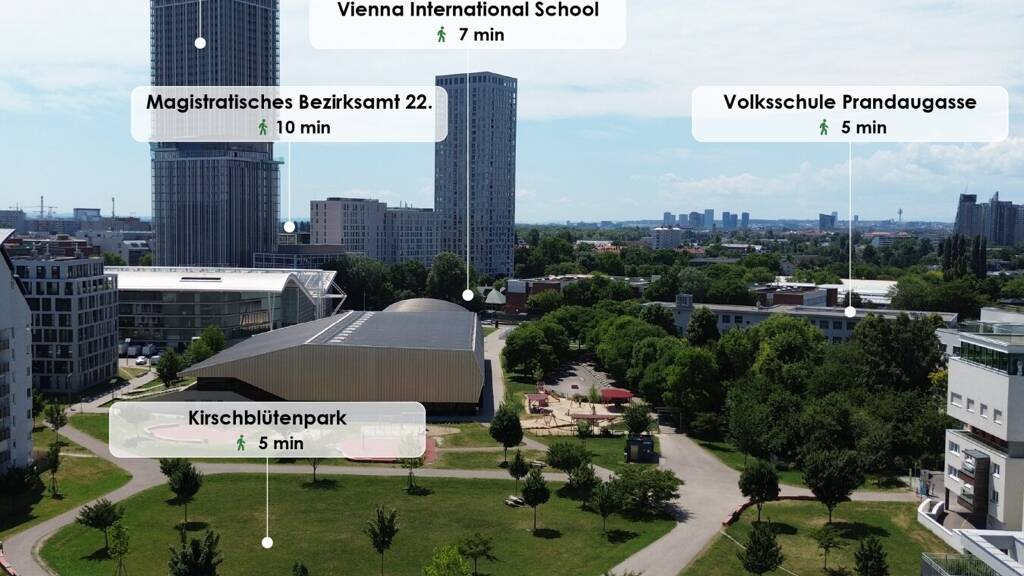 Zwischen Donaufeld und dem Kirschblütenpark entsteht das Objekt in einer ruhigen Wohngegend. Neben zahlreichen Freizeit- und Erholungsmöglichkeiten an der Alten Donau und der Donauinsel ist auch das Wiener Stadtzentrum mit öffentlichen Verkehrsmitteln bestens erreichbar. Die Station Kagran der U-Bahnlinie U1 befindet sich in Gehweite. Somit ist die Wiener Innenstadt direkt und in kurzer Zeit erreichbar. Darüber hinaus bietet die Nähe zum größten Wiener Einkaufs- und Entertainmentcenter Donau Zentrum sowie zur Veterinärmedizinischen Universität Wien zusätzliche Attraktivität. Die Straßenbahnlinien 25 und 26 und die Buslinie 27A stehen unmittelbar vor der Haustür zur Verfügung und runden das hervorragende Angebot an öffentlichen Verkehrsmitteln ab. Supermärkte, Ärzte und Apotheken sowie weitere Geschäfte des täglichen Bedarfs befinden sich in direkter Umgebung des Objektes. Die Kombination aus ruhigem Wohnviertel und hervorragender öffentlicher Erreichbarkeit trägt zu einer langfristig attraktiven Wohnlage für Mieter und Wohnungseigentümer bei.