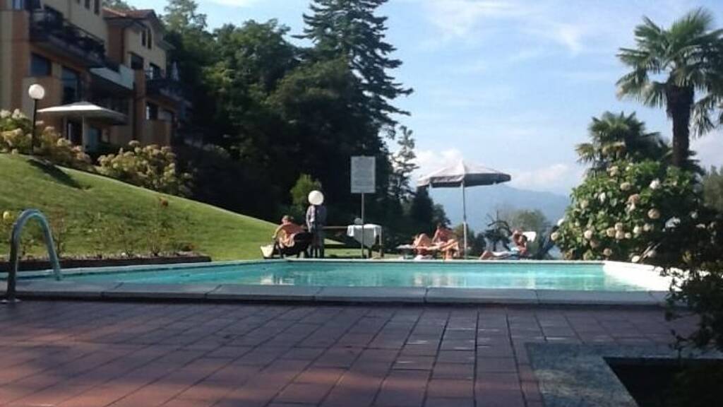 Verde Lago: 4-Zimmer-Maisonette-Wohnung mit Balkon. Ca. 3.800 m² Grundstück mit Pool und botanischem Garten. Strand. Einzelgarage. Traumseesicht