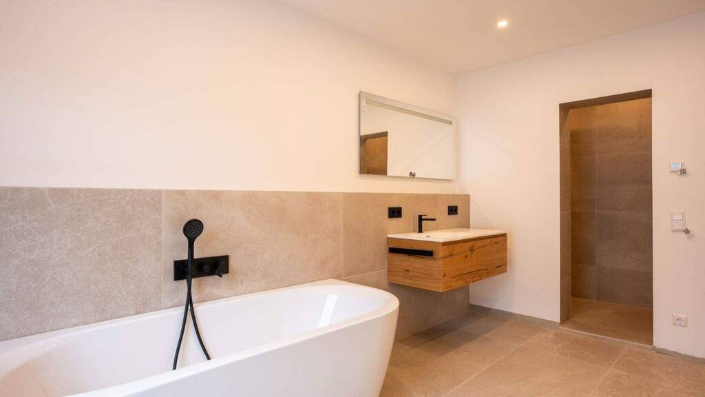 Das großzügige Badezimmer ist modern gestaltet und verfügt sowohl über eine Badewanne als auch über eine begehbare Dusche. Ergänzt wird das Raumangebot durch zwei zusätzliche Gäste-WCs, die den Wohnkomfort spürbar erhöhen.