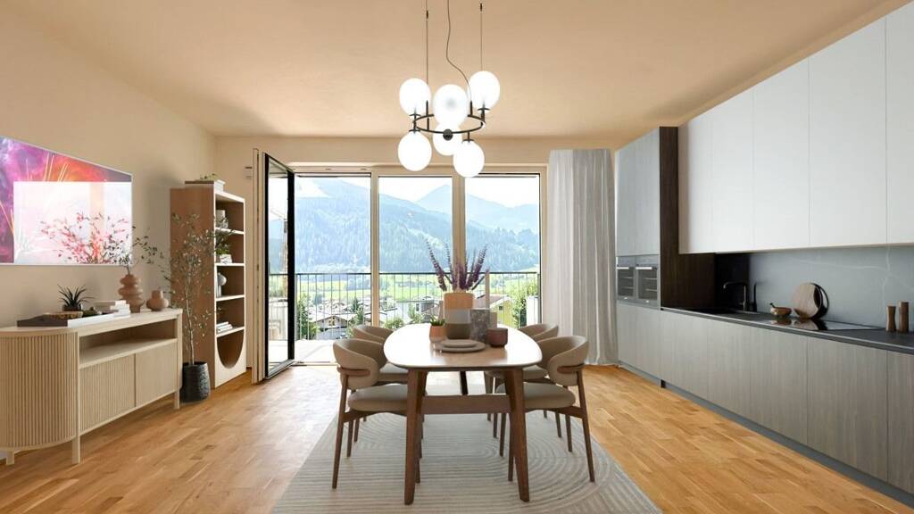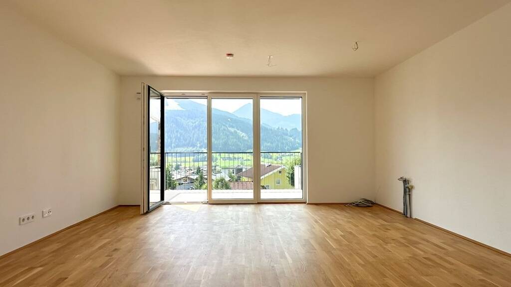 Hochwertiges Eichenparkett und der Blick auf die umliegende Berglandschaft verwöhnen Genießer. Große Fenster durchfluten die Räume mit Licht. Im Sommer sorgen die elektrischen Außenjalousien für angenehm kühle Räume. Auf dem Balkon finden Sie Platz für Kräuterbeete oder einen Griller und eine gemütliche Sitzgarnitur zum Entspannen an der frischen Luft.