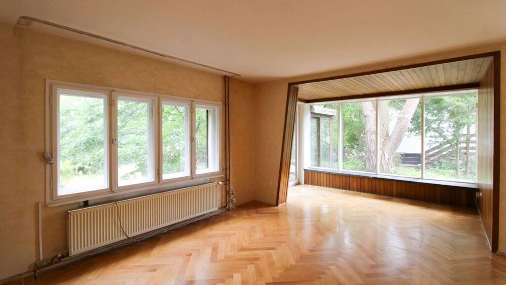 Der Grundriss verfügt insgesamt über ca. 114,84 m² Wohnfläche. Highlight der Immobilie stellt das große offene Wohn- und Esszimmer mit seinem schönen alten Fischgrätenparkett und der großen Fensterfront mit Blick auf den vorderen Grundstücksteil dar. Von hier aus haben Sie auch einen direkten Zugang zur Terrasse und zu dem Kaltwintergarten. Eine separate Küche und ein kleines Gäste-WC runden das Raumangebot im EG ab.