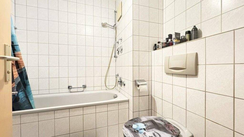 Das zeitlos geflieste Badezimmer ist mit einer Badewanne mit Duschfunktion, Waschbecken und WC ausgestattet.
