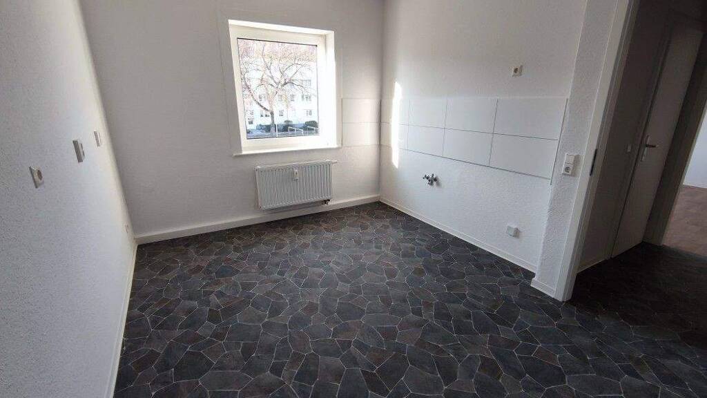 + KĂĽche mit Fenster, modernem Fliesenspiegel und CV Bodenbelag in Steinoptik (Waschmaschinenanschluss) + Duschbad mit Fenster + Flurbereich mit CV Bodenbelag in Steinoptik + Wohnzimmer mit CV Belag in Holzoptik