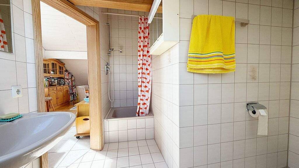 Im Obergeschoss befindet sich ein großzügiges Elternschlafzimmer sowie ein großes, familiengerecht gestaltetes Kinderzimmer, das aus zwei ursprünglich getrennten Kinderzimmern zusammengelegt wurde mit Erker und Zugang zum sonnigen Südbalkon. Das Tageslichtbad ist mit Badewanne, Dusche, Waschbecken und WC ausgestattet und bietet ausreichend Platz für die ganze Familie. Das ausgebaute Dachgeschoss überzeugt mit einem geräumigen Studiozimmer, welches vielfältige Nutzungsmöglichkeiten bietet - beispielsweise als Jugendbereich, Homeoffice oder Gästebereich. Ergänzt wird diese Ebene durch vorhandene Küchenanschlüsse, ein Duschbad mit WC und Fenster sowie einen praktischen Abstellraum.