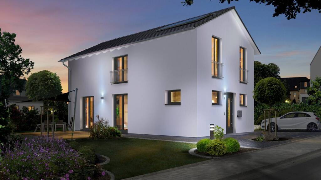 Fläche EG + OG ca. 128 m², isolierte Bodenplatte, hochwertige Marken-Fenster, Rollladen im gesamten Haus, Wärmepumpe von Vaillant mit Fußbodenheizung, Außenwasserhahn, Bodeneinschubtreppe, PV Photovoltaikanlage 5 kWp, Bad + WC gefliest und im Standard ausgestattet