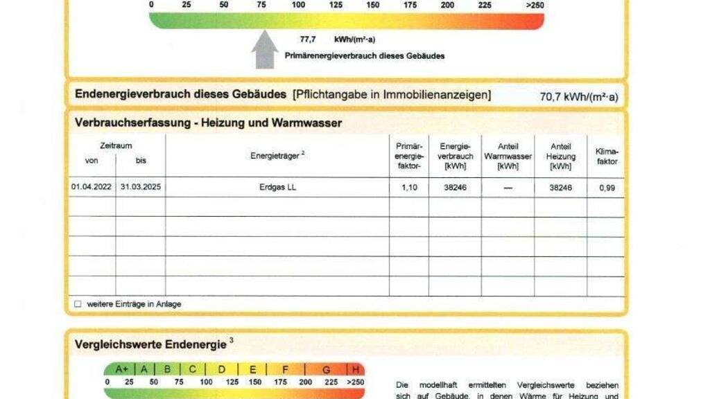 Angaben lt. ENEV 2014: Verbrauchsausweis, Kennwert: 70,70kWh/(m²*a), wesentlicher Energieträger ist Gas, Bj. 2025, Klasse B
