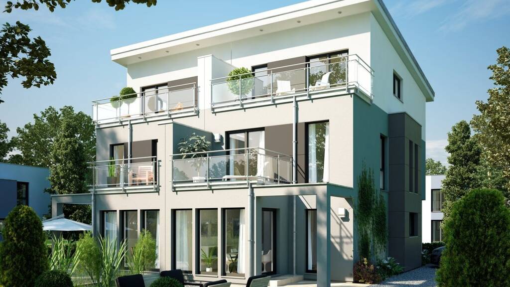 Eine herrschaftliche Villa für zwei Familien: Dieses Fertighaus lässt bereits von außen erahnen, wie großzügig und komfortabel es im Innern zugeht. Die Basis des Entwurfs bildet ein kubischer Baukörper mit sehr flach geneigtem Pultdach, an den zwei Rechteck-Erker mit Flachdach sowie ein üppig verglaster Wintergarten mit Terrassenpergola angedockt wurden. Zwei Balkone erweitern die Wohnfläche jeder Gebäudehälfte zusätzlich um sonnige Relaxbereiche in luftiger Höhe. Umrahmt werden sie von filigranen Glasbrüstungen, die den modernen Charakter des Hauses unterstreichen. Um die Privatsphäre beider Parteien zu wahren, sind die Freisitze mittels Wandsegmenten voneinander abgetrennt. Die Fassade hüllt sich in einen strahlend weißen Mineralputz, der von dunkelgrauen Flächen akzentuiert wird. Die Raumaufteilung ist auf den turbulenten Familienalltag einer vierköpfigen Familie ausgerichtet. Damit den Wohnräumen mehr Platz zukommt, wurde auf unnötige Verkehrswege verzichtet. So gibt es beispielsweise kein eigenes Treppenhaus. Stattdessen integriert sich der Aufgang in das Obergeschoss harmonisch in den Kochbereich. Die Küche avanciert damit zum zentralen Treffpunkt: Wer das Haus verlässt und wer nach Hause kommt, wird erst einmal einen Stopp an der gemütlichen Theke einlegen. Für einen Plausch bei einer Tasse Kaffee, Tee oder Kakao ist immer Zeit! Entspannt wird sich auf der großen Couch, die einen gebührenden Stellplatz im Wintergarten-Erker findet. Von hier ist es nur einen Katzensprung auf die Terrasse, die im Sommer zum zweiten Wohnzimmer wird. Ergänzt wird das Raumangebot durch ein Gäste-WC, einer Abstellkammer für all die Dinge, die man nicht täglich benötigt, sowie einem Technikraum. Das Obergeschoss ist für den Nachwuchs reserviert: Zwei interessant geschnittene Kinderzimmer mit sonnigem Erker-Platz, ein Gästezimmer und ein Bad mit Dusche und WC bieten Luxus pur. Die Eltern beziehen ihr Reich im Dachgeschoss: Die Treppe führt direkt zum großen Schlafzimmer mit en suite Ankleide und Wellnessbad. Ein echtes Highlight ist die Dachterrasse mit Weitblick über die Umgebung.