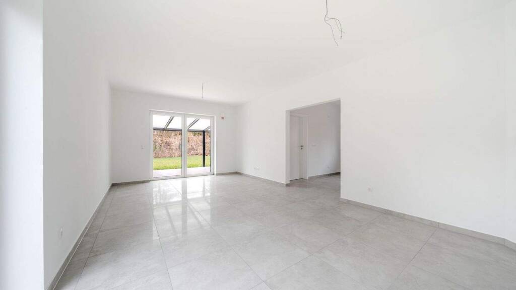 Der Mittelpunkt des Hauses ist der helle Wohnbereich mit direktem Zugang zur überdachten Terrasse. Von hier aus besteht eine offene und praktische Verbindung zur Küche, die den Wohnraum ideal ergänzt und kurze Wege schafft.