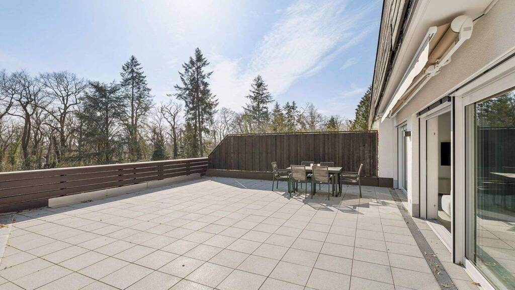 Von hier aus gelangen Sie auf die großzügige, sonnige Süd-Terrasse, die mit einer elektrischen Markise ausgestattet ist. Große, bodentiefe Schiebetüren sorgen für ein lichtdurchflutetes Ambiente und schaffen eine harmonische Verbindung zwischen Innen- und Außenbereich. Integrierte Fliegengitter erhöhen zusätzlich den Wohnkomfort.