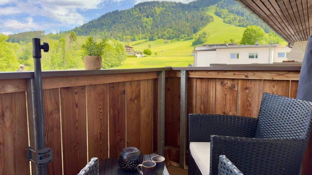 Die Wohnung besteht neben einem geräumigen Schlafzimmer auch aus einem Badezimmer, einer Küche und einem Balkon mit traumhafter Aussicht auf die umliegenden Berge.