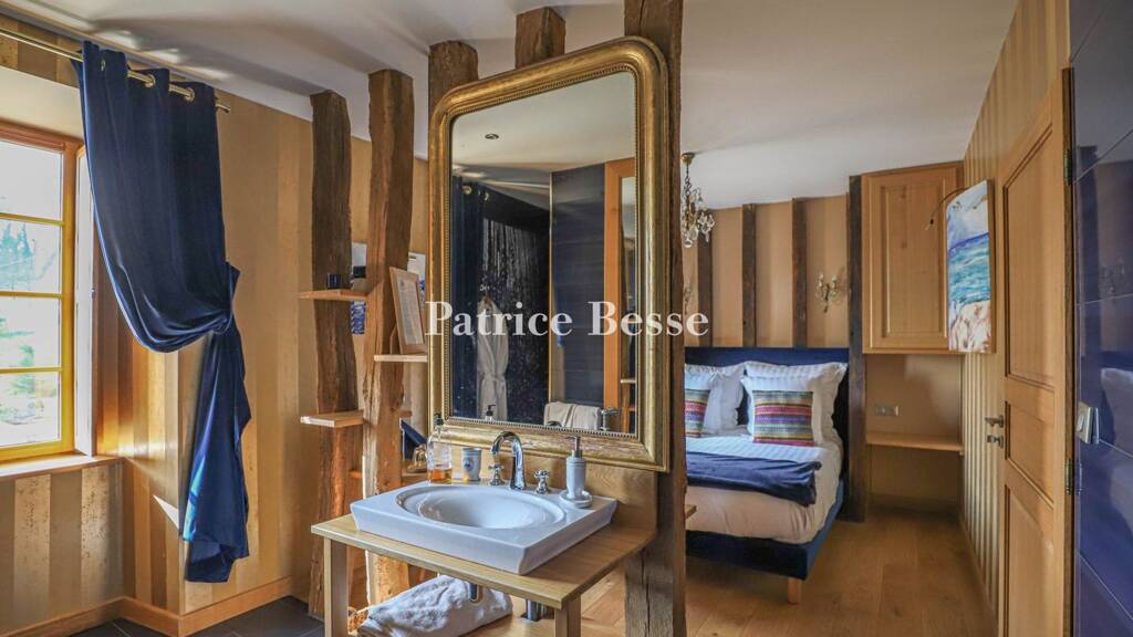 The central door of the manor house opens onto a hallway providing access to the main staircase, a passageway and two sitting rooms. The walls are of exposed stone, the ceiling features wooden beams and the floor is laid with cabochon-style Burgundy stone tiles. The passageway leads to a cupboard and a lavatory. On one side of the hallway, an extensive sitting/dining room is generously lit by large south-facing windows. Again, the flooring is Burgundy stone tiles with black cabochons and the walls are wood-panelled. An 18th century wooden fireplace stands in the centre of the room. Continuing northwards, the kitchen connects to a dining room. The floor is also of stone and glass doors provide access to a summer lounge. This is paved with slate slabs and features a central fireplace, as well as a swimming pool. In one corner, there is a service entrance and a small utility room. On the other side of the hallway, a second sitting room features straight strip parquet flooring, a Tuffeau stone fireplace, exposed stone walls and a beamed ceiling. A study with similar floor and ceiling follows in a row. Finally, at the eastern end of the manor house, there are a bedroom, a bathroom, a lavatory and a wooden staircase. The floors are tiled.