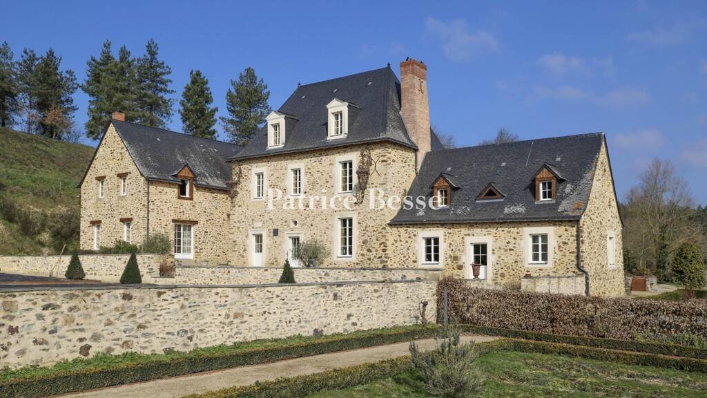 A courtyard and two formal rectangular gardens face the manor house to the south. To the east flows the river Mayenne. To the west, the wooded hillside gently slopes down. To the north, there are a technical building and a garage, farm buildings, a stream, woodlands and ponds. The property is unoverlooked.
