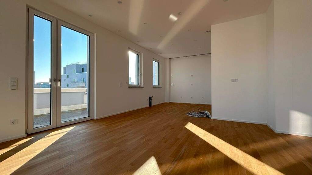 . Die Dachterrasse erstreckt sich über die gesamte Ostseite (Dr.-Pfleger-Str.) . Lichte Raumhöhe: 2,75 m . Dreifachverglaste, großzügig dimensionierte Fenster mit einer lichten Höhe von 2,50 m inklusive Schiebhebetüren zur Dachterrasse . Zusätzliche Verglasung im Bereich der Ostfassade . Elektrisch betätigte Raff storeanlagen für alle Fenster . Abgehängte Decke mit integrierter Spotbeleuchtung und Integration für die zentrale, kontrollierte Wohnraum Be- und Entlüftung, Kühldecke . Fußbodenheizung . Zwei PKW-Stellplätze möglich und einen Kellerraum in der Tiefgarage (4,3 m²) . Einen Stellplatz inklusive Vorrüstung für den optionalen Anschluss einer Ladestation (Wallbox) . Fliesen in den Bädern, Parkett in allen Räumen . Stumpf anschlagende Innentüren mit innenliegenden Bändern