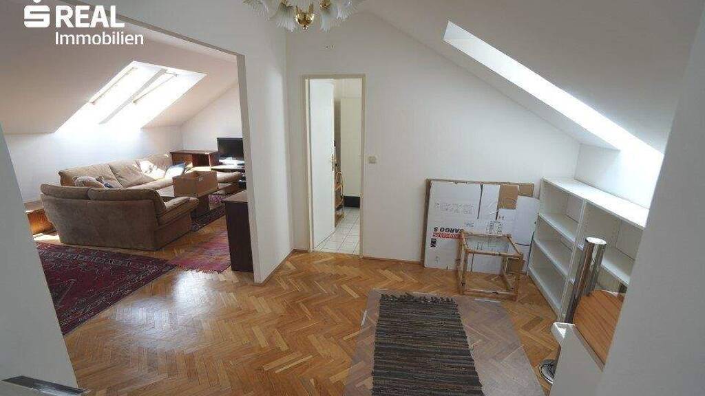 Die Wohnung im 1. Stock (=Dachgeschoß) besteht aus einem offenem Vorraum, Bad mit Wanne und Fenster, Toilette, einem großzügigen Wohnbereich mit Essplatz, Küche mit Speis und 2 weiteren Zimmern.