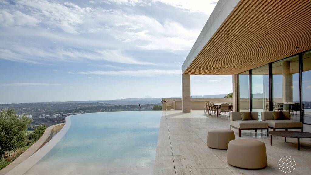 Im Außenbereich bietet die Villa einen wahren Rückzugsort mit einem Infinity-Pool, einem kleineren angrenzenden Pool und einer Dusche aus Iroko-Holz. Mehrere Terrassen, ein überdachter Essbereich im Freien, eine voll ausgestattete Sommerküche und Bar sowie eine Dachterrasse zum Entspannen machen die Villa zu einem perfekten Ort der Unterhaltung.