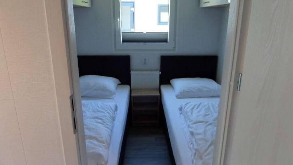 Schlafzimmer mit 2 Einzelbetten und Wandschränken.