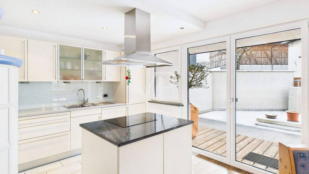 Im Erdgeschoss führen die Zugänge - sowohl von der Vorder- als auch von der Rückseite - in ein lichtdurchflutetes Wohnzimmer mit offener Küche und einem gemütlichen Kachelofen. Auf derselben Ebene befinden sich zudem ein Gäste-WC, ein Arbeitszimmer ideal als Homeoffice sowie ein praktischer Abstellraum.
