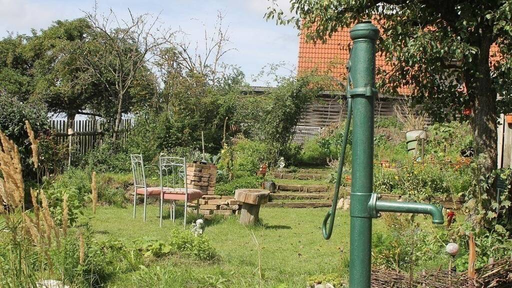 – Ein liebevoll angelegter Garten mit Beeten, Feuerstelle, Raketenofen und einem eigenen Brunnen