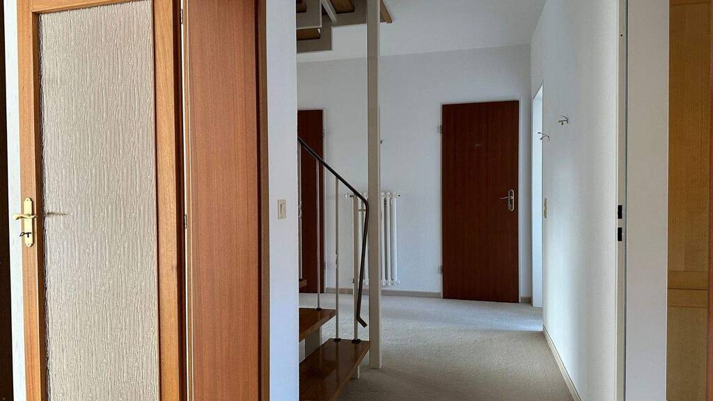 Über eine interne Treppe gelangt man in das Dachgeschoss der Wohnung. Hier stehen zwei weitere Schlafzimmer, ein Duschbad sowie praktische Abstellflächen zur Verfügung, die zusätzlichen Stauraum bieten. Die Wohnräume beider Ebenen sind mit Teppichboden ausgestattet und schaffen eine angenehme, wohnliche Atmosphäre.