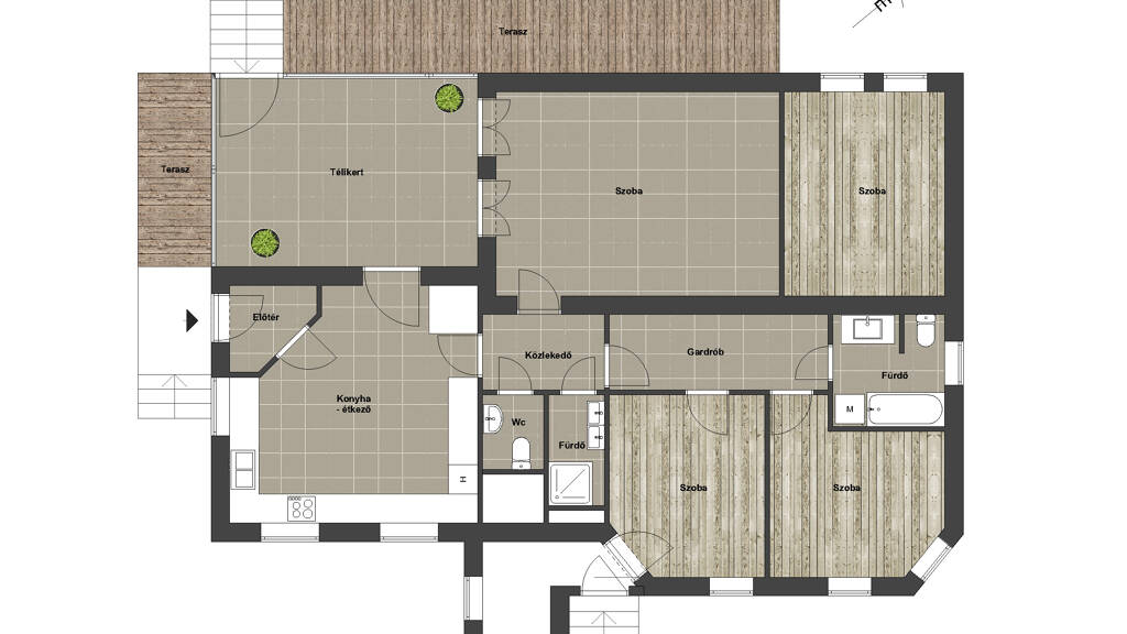 Räume: Küche - Esszimmer, Wintergarten, 4 Schlafzimmer, Ankleidezimmer, Badezimmer mit Dusche, Badezimmer mit Badewanne und WC, separates WC