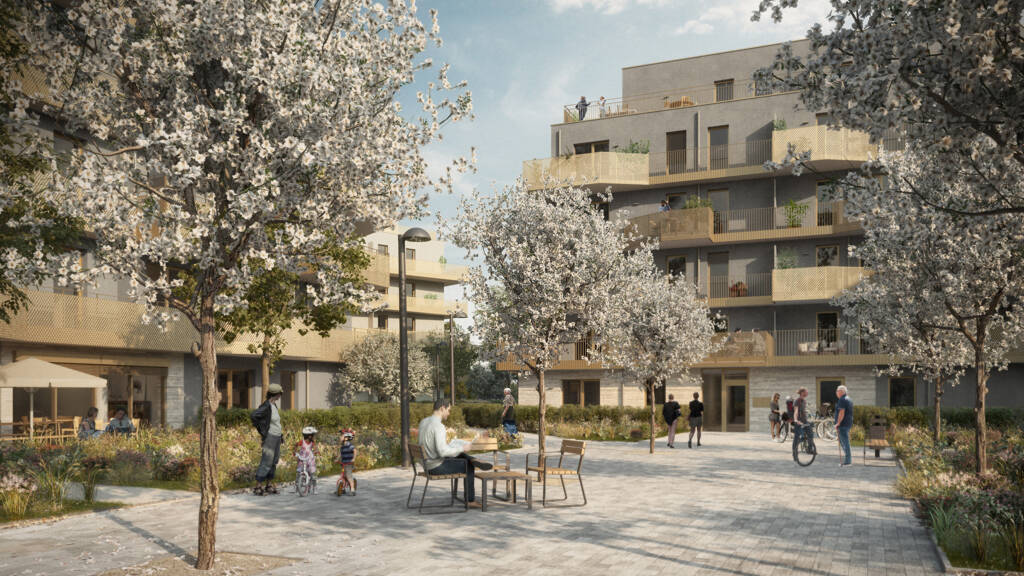 Ein weiteres Merkmal des Quartiers ist seine autofreie Oberfläche, was zur Reduktion von Lärm und Luftverschmutzung beiträgt und die Sicherheit der Fußgänger erhöht. Für Elektrofahrzeuge stehen Ladestationen in der Tiefgarage zur Verfügung, was die Nutzung umweltfreundlicher Transportmittel fördert. Die begrünten Plätze zwischen den Häusern, bieten den Bewohnern schöne Ruheoasen um die sonnigen Tage auszuschöpfen.